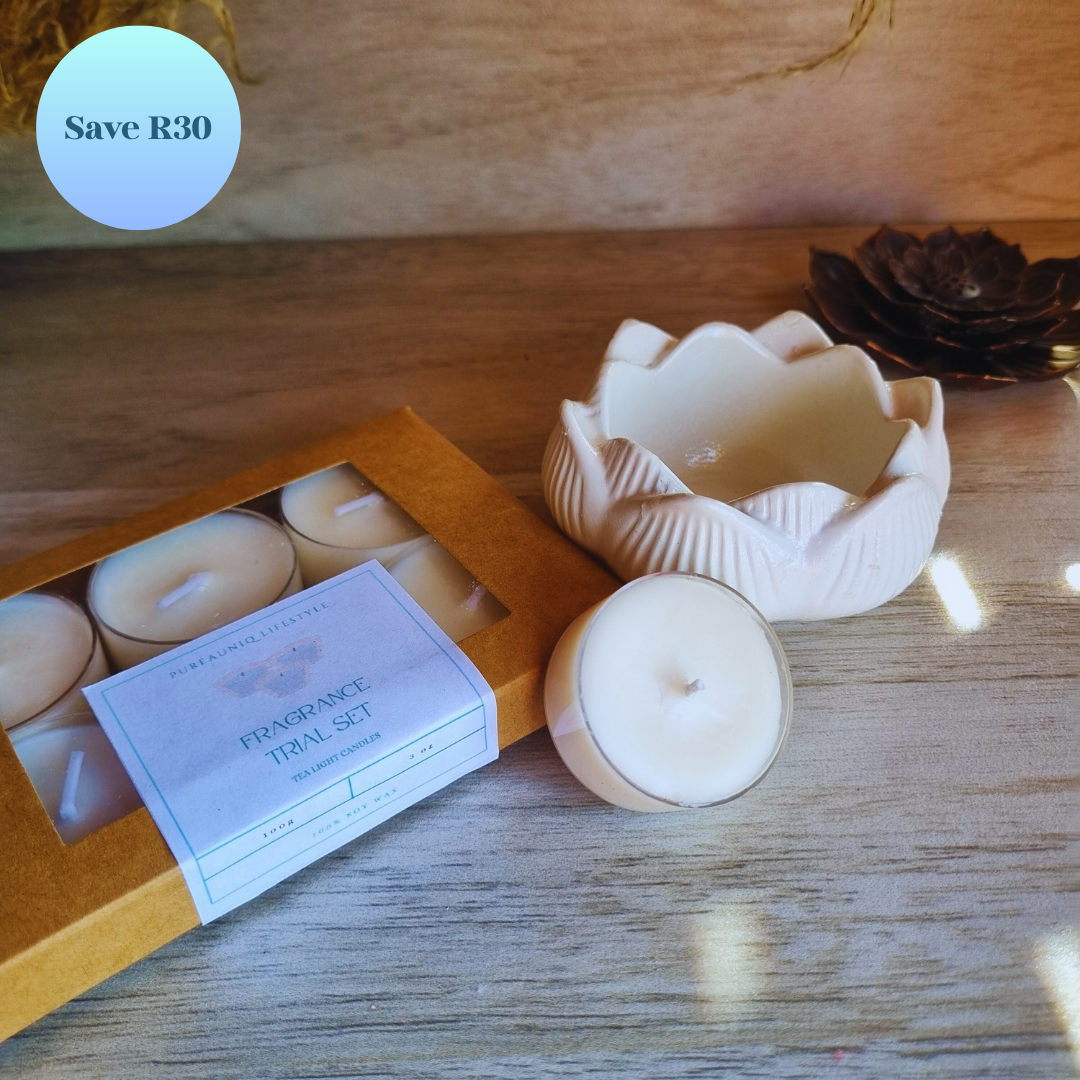 ️ Tea Light Candles (Fragrance Trial Set) – A collection of hand-poured mini candles, each infused with signature scents to help you discover your favorite fragrance.
